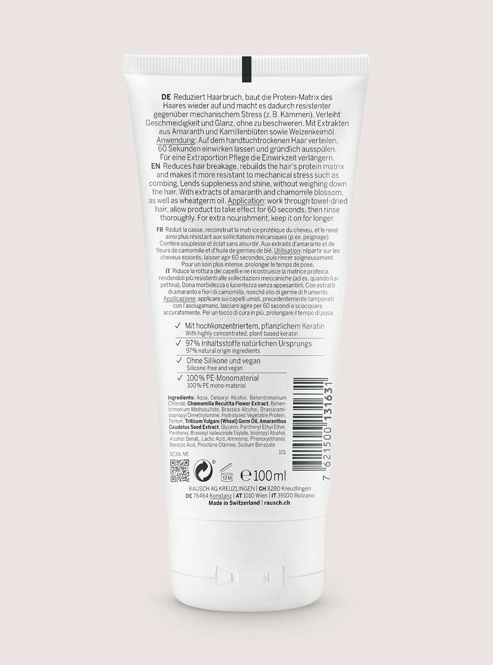 La maschera che ripara e cura in modo intensivo i capelli stressati e fragili. Riduce la rottura, ricostruisce la matrice proteica e ripristina il 60 % della struttura danneggiata. In soli 60 secondi dona ai capelli morbidezza e lucentezza, senza appesantirli. La cheratina vegetale altamente concentrata contenuta nella maschera ripara i capelli in profondità e li protegge dalle sollecitazioni meccaniche come quelle del pettine o dello styling. Con estratto di amaranto, nostro estratto di fiori di camomilla nonché olio di germe di frumento.