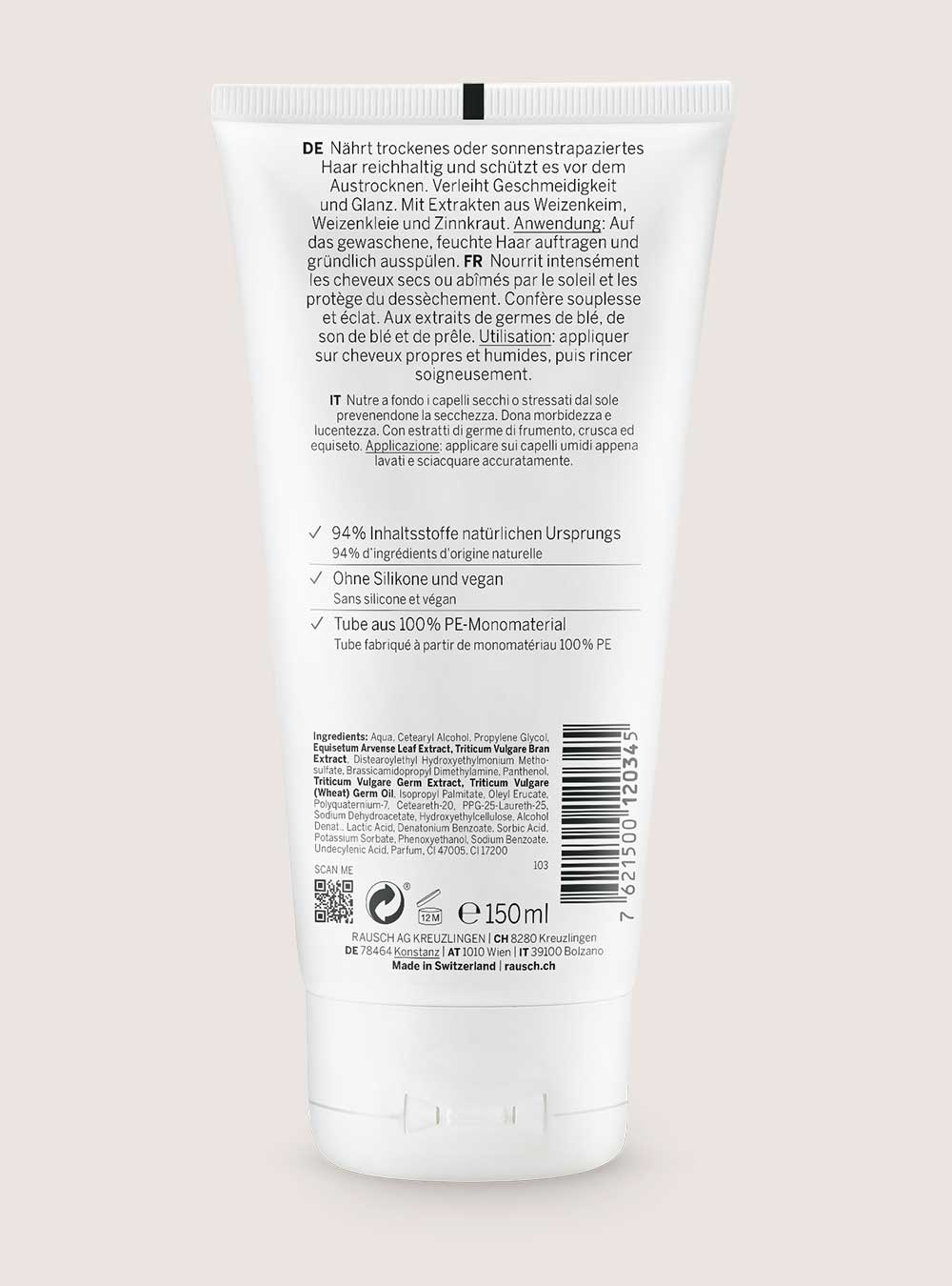 Con il 94 % di ingredienti di origine naturale, il balsamo contiene un concentrato di natura, tra cui olio di germe di frumento nonché estratti di germe di frumento, crusca di frumento svizzera ed equiseto di alta qualità ottenuto dalla raccolta di piante selvatiche. La formula priva di siliconi è completamente vegana e colpisce per la sua fragranza fresca e cipriata.